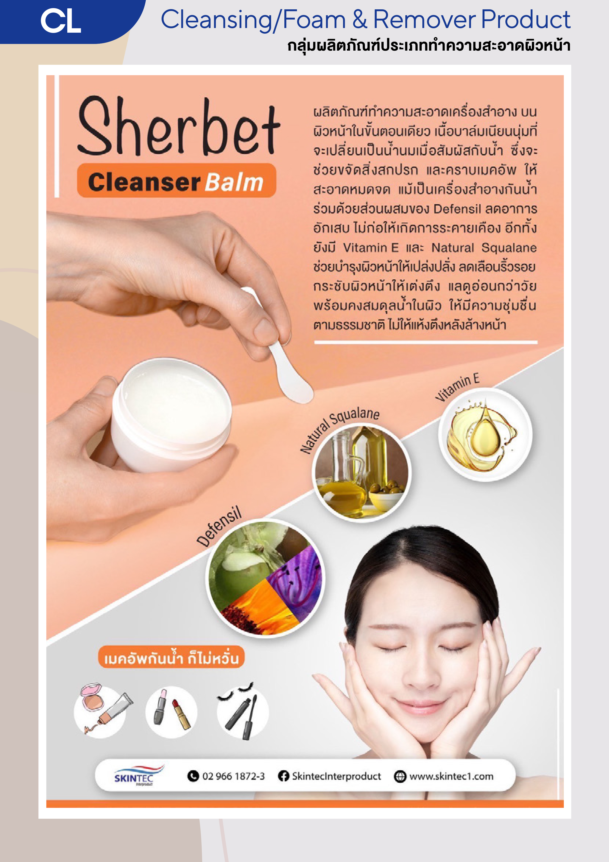 ผลิตภัณฑ์ทำความสะอาดเครื่องสำอางบนผิวหน้า เนื้อบาล์มเนียนนุ่มที่จะเปลี่ยนเป็นน้ำนมเมื่อสัมผัสกับน้ำ ซึ่งจะช่วยขจัดสิ่งสกปรกและคราบเมคอัพให้สะอาดหมดจด แม้เป็นเครื่องสำอางกันน้ำ