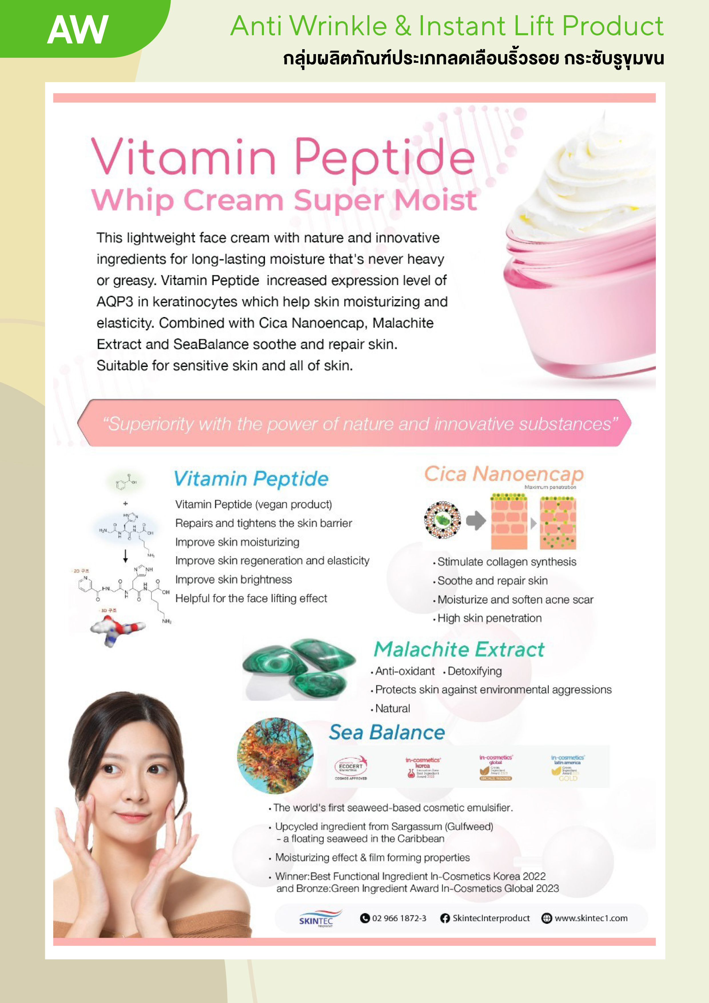 ครีมลดริ้วรอย ลดความหยาบกร้านของผิวในทันทีที่ใช้ เพิ่มความชุ่มชื้น เต่งตึง หน้าดูสดใส ฟื้นฟูผิวหน้าที่อ่อนล้า ปกป้องผิวทำให้กักเก็บน้ำได้นาน